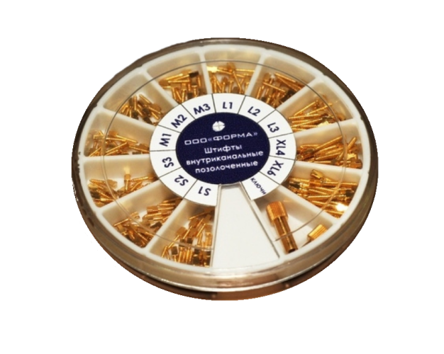 Чтобы повысить коррозионную устойчивость анкерных штифтов Форма, они покрываются золотым напылением. Конусный профиль и специальный хвостовик под ключ обеспечивают легкость установки, а специальная нарезка снижает давление на дентин.