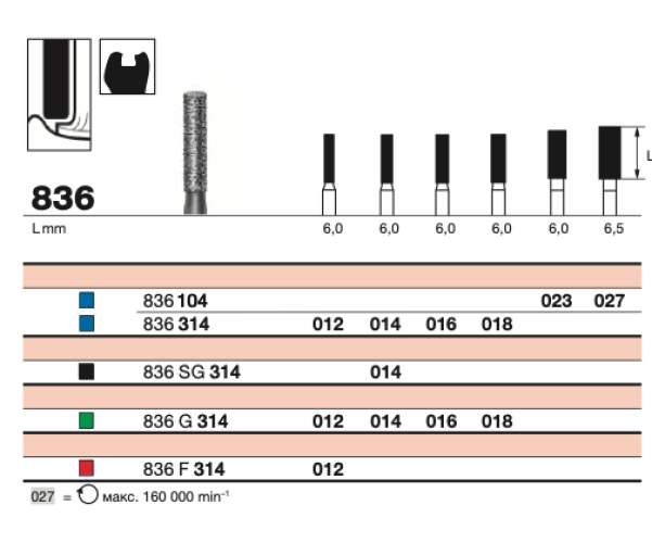 Бор алмазный ECO /E 836 C 314.018 применяется в стоматологии для точной обработки зубных поверхностей. Его устанавливают в турбинный наконечник и используют при подготовке полостей к реставрации или коронкованию.